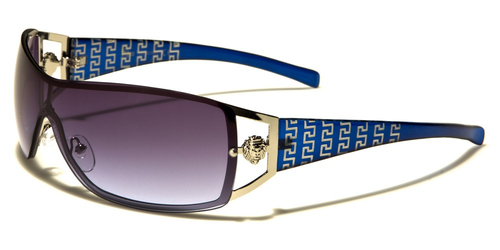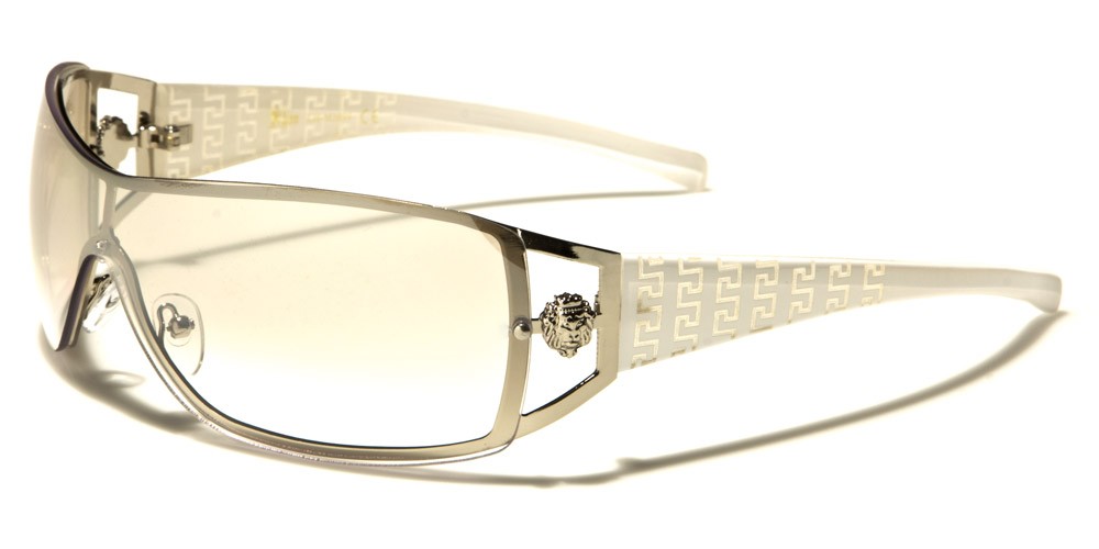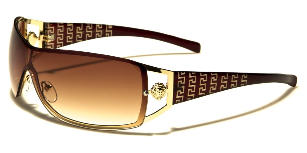 These Kleo women’s bulk sunglasses feature a unique rectangle design that boasts a shield-style curvature that is designed to minimize sun glare and rock today’s upscale fashions. The side embellishments feature an open style temple with a distinct Kleo embellishment. The temples highlight graphic designs that put this unique style over the top, easily mixing and matching with upscale brands, casual attire or designs that are more formal. Colors include silver with black, silver with white, silver with red, silver with mauve, silver with blue and brown with gold.