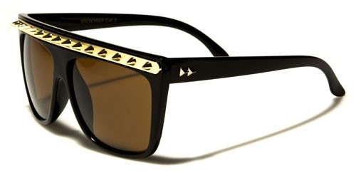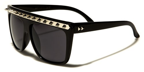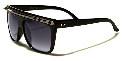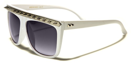 Bling it up with wild spikes! These plastic Retro Rewind bulk sunglasses feature a sweatbar lined with a gunmetal, gold or silver metal strip with spikes. The full rims hold rectangular-shaped sunglasses and a molded nosepiece. The straight, slim stems feature fully-curved ear pieces. The sunglasses come in solid colors: white and black. The lenses are in smoke, gradient smoke and brown. The stems also hold the metal Retro Rewind logo of two low pyramids. These sunglasses are made of lightweight plastic to ensure your comfort as they protect your eyes from the sun’s harmful rays.